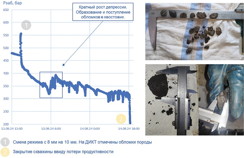 Далее из графика давления на стенке скважины по зависимостям, полученным из геомеханической модели, были рассчитаны давления обрушения для разных типов коллекторов и сопоставлены с историческими графиками забойных давлений. Из сопоставлений стало очевидно, что обрушение породы и вынос ее на устье скважины наблюдался как раз на тех скважинах, где забойное давление было снижено ниже давления обрушения. При этом с учетом полученной зависимости становится очевидно, что на риск обрушения породы влияет не столько величина созданной депрессии, столько скорость, с которой эта величина была достигнута (рис. 9).