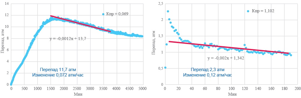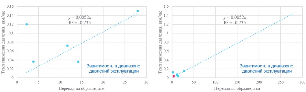 Далее по всем отобранным образцам была аппроксимирована скорость снижения давления (в атм./час) и построена зависимость скорости изменения давления от созданного перепада. Поскольку собственных точек было получено не слишком много, были привлечены данные аналогичных отложений соседнего месторождения, которые эту зависимость подтвердили.