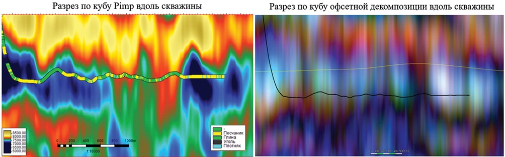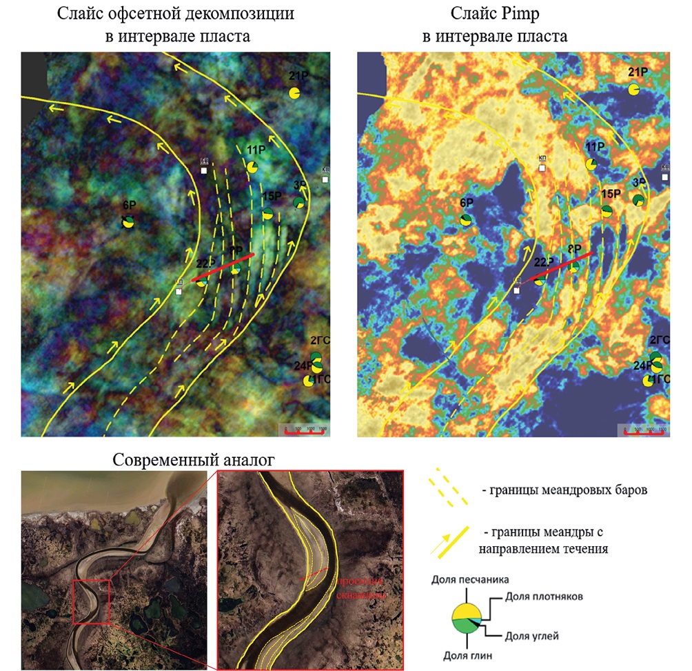 Плановая горизонтальная скважина 77ГС заложена с проектной глубиной 4444 м в области развития крупного русла, которое надежно прослеживается как по офсетной декомпозиции, так и по данным сейсмической инверсии (рис. 3). Песчаные отложения в пределах русла представлены разновозрастными прирусловыми валами — песчанистыми телами, которые формируются в результате латеральной аккреции на выпуклых берегах поворота. В типичном случае прирусловой вал имеет серповидную форму в плане и клиновидную в вертикальном сечении. В случае наложения друг на друга нескольких валов, образованных посредством развития речной системы во времени и формирования разных циклов миграции, могут образовываться крупные по вертикали (мощности) объекты. По сейсмическим данным прирусловые валы характеризуются преимущественно пониженными значениями Pimp (синий цвет) и усилением амплитуд дальних удалений по офсетной декомпозиции (яркие холодные цвета).