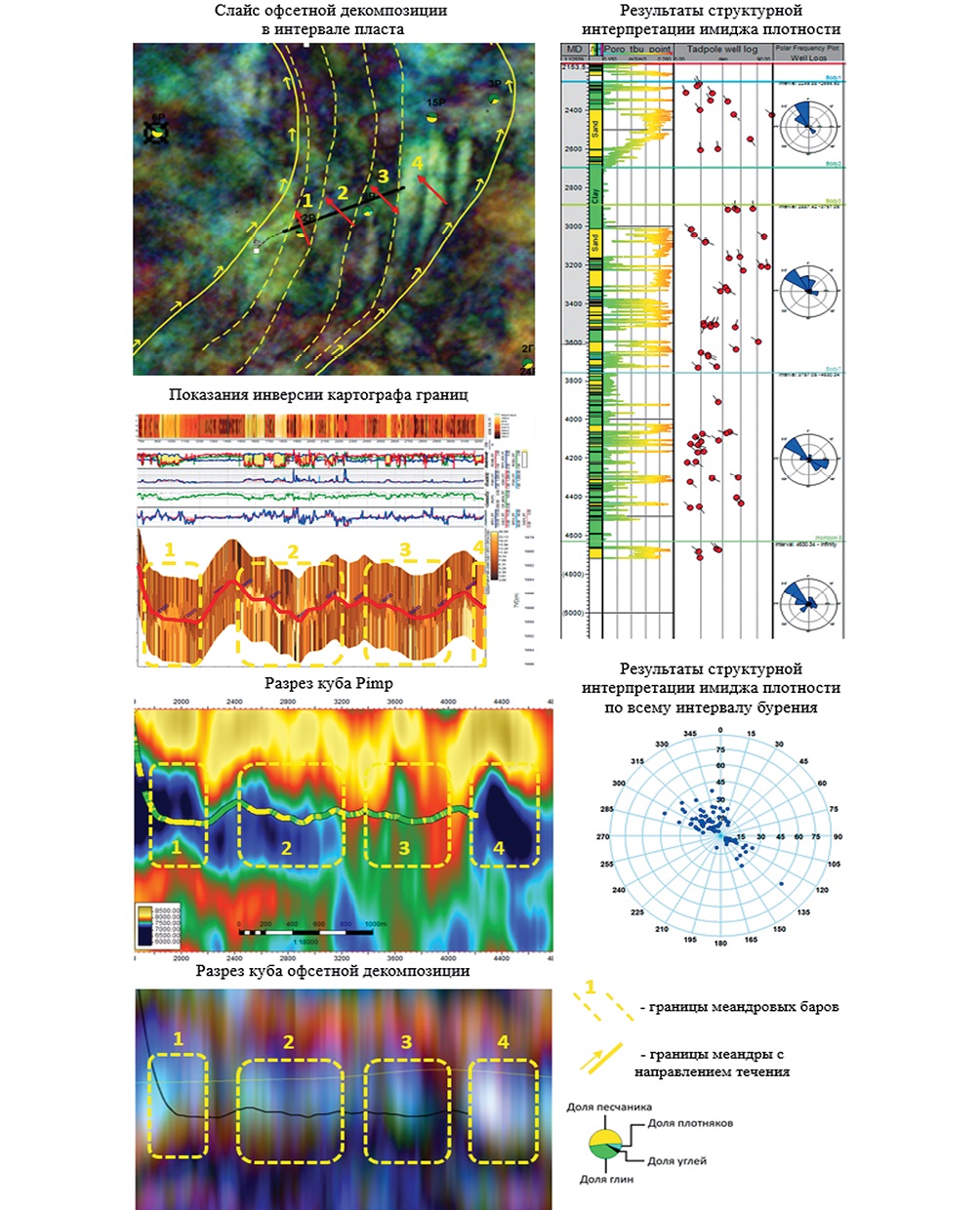 В процессе бурения скважины 77ГС на момент достижения проектной глубины 4720 м эффективная проходка по коллектору составила 1069 м. Выполнен комплексный анализ результатов бурения скважины 77ГС с сейсмическими данными, картографом границ и результатами структурной интерпретации имиджера плотности (рис. 4). В процессе бурения вскрыто 4 прирусловых вала, сформированных в процессе развития пояса меандрирования. Первый вал, вскрытый на глубинах 2390—2600 м, по сейсмическим данным представляет собой первичный сформировавшийся объект в рамках развития речной системы. Согласно структурной интерпретации имиджа плотности основой азимут слоистости совпадает с направлением течения реки и составляет 350°. Границы объекта надежно прослеживаются по данным картографа границ и сейсмическим данным. С глубины 4015 м и до забоя 4475 м вскрыты второй и третий объекты, представленные более молодыми прирусловыми валами.