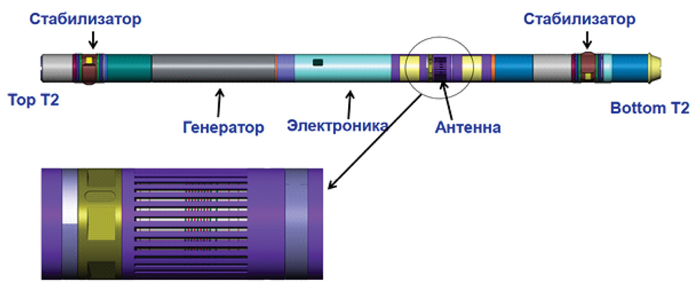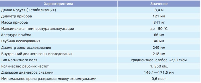 Скважинный модуль MagTrak™ состоит из зондовой части, блока обрабатывающей электроники и двух медленно вращающихся стабилизаторов, которые используются для устранения пагубного эффекта от возникающих в процессе бурения вибраций (рис. 1). Система регистрации прибора требует поддержания постоянной циркуляции бурового раствора в процессе бурения для обеспечения выработки необходимой мощности излучения ЯМР даже в хорошо проводящих буровых растворах. Дополнительно стоит учитывать, что в секции скважины диаметром 155,6 мм (6,125") номинальный размер зоны исследования прибором ЯМК MagTrak™ типоразмером 121 мм (4,75") составляет 249 мм (9,8") и представлен тороидальной областью, которая не соприкасается со стволом скважины (рис. 1). Основные технические характеристики модуля 4.75" MagTrak™ представлены в таблице 1.