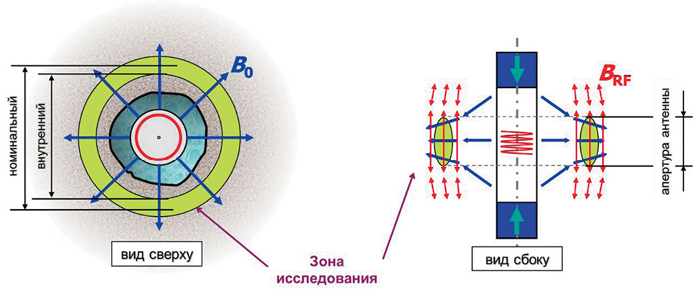 Рис. 1. Скважинный модуль MagTrak™ и схема зоны исследования ЯМК MagTrak™