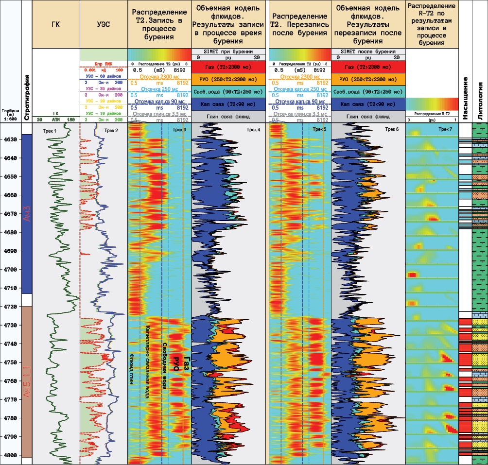 Распределение Т2 показывает дифференциальное распределения сигналов ЯМР на времени поперечной релаксации Т2 (по оси X время релаксации, по оси Y величина пористости), для записей в процессе бурения и на подъёме после бурения, с нанесёнными на них отсечками (таблица 2). Модели флюидов рассчитаны из распределений Т2 и показывают количественную оценку долей различных типов флюидов в зоне исследования метода ЯМК (~31—61 мм), представленные в виде объёмных моделей, состоящие из долей: глинисто-связанного флюида (серая заливка), капиллярно-связанного флюида (синяя заливка), объёма свободной воды (голубая заливка), объёма РУО (оранжевая заливка), объём остаточного газа (красная заливка). Распределение R-T2 показывает результаты двумерной инверсии, которые позволяют качественно разделить сигналы ЯМР от пластовых флюидов (рис. 2).