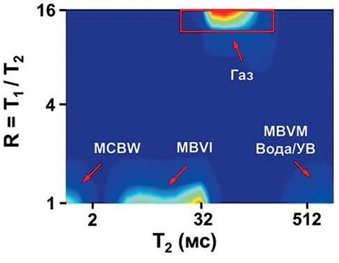 В качестве дополнительного подхода к выделению газовых зон был использован метод двумерной инверсии ЯМР отношений распределений Т1 и Т2 [1]. Методика эффективна для обнаружения газа благодаря высокому контрасту газа и воды, имеющих разные величины коэффициента молекулярной диффузии, которые будут отображаться по-разному на распределении Т1 и Т2 [1]. Лёгкие УВ будут иметь длинные времена на распределении Т1 и относительно короткие на распределении Т2 и, как следствие, высокое отношение R = T1/T2 (рис. 2). По оси X приведено время релаксации распределения T2 в миллисекундах, по оси Y — отношение распределений времени T1/T2 [1].
