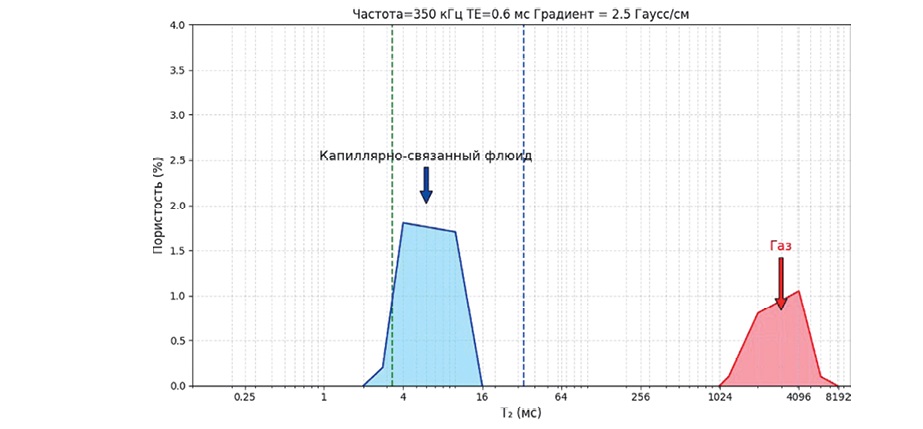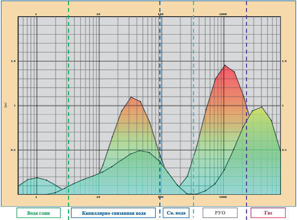 Типизация флюидов становится возможной благодаря различию их физических свойств, которые определяют положение сигналов ЯМР [3] на распределении Т2. С целью типизации флюидов использован метод отсечек (рис. 3). Для разделения вклада в сигнал ЯМР от флюидов, находящихся в породах с разным размером пор, и непосредственно для типизации самих флюидов на основе различий их релаксационных свойств.